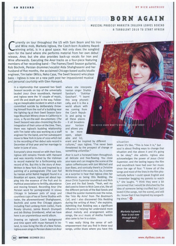 Currently on tour throughout the US with Sam Beam and his Iron and Wine mob, Marketa Irglova, the Czech-born Academy Award-winning artist is in a good space. Not only does the songbird open for the band where she performs material from her own debut release, but she also provides back-up vocals for Iron and Wine afterwards.
